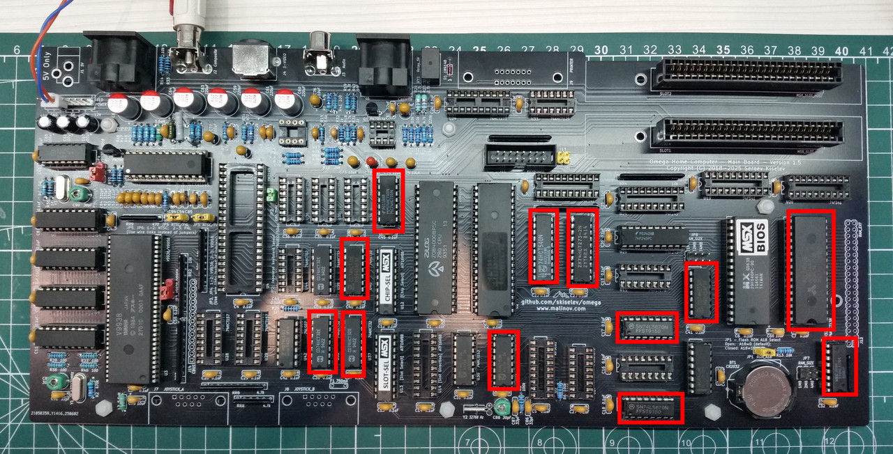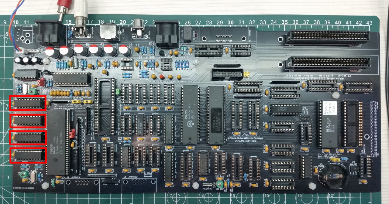 Перемычки JP3 и JP4 надо установить в положение 1-2. Это для VDP V9938. К сожалению, V9958 мне купить не удалось. Неправильная установка этих перемычек может привести к выходу из строя дорогой микросхемы V9938/9958. На плате все перемычки подробно описаны, что снижает вероятность ошибки.