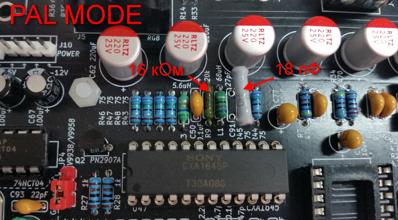 Для настройки кодера под PAL-режим надо использовать резистор R9 на 16 кОм и конденсатор C91 на 18 пФ. Я эти детали не паял т.к. хочу еще проверить и NTSC-режим:
