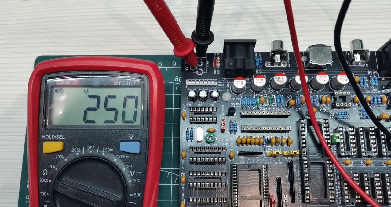 Для начала проверил сопротивление между +5V и GND (земля). Получилось 250 Ом, что нормально. В инструкции написано про 300 Ом, но в данном случае это не критично. Главное, что нет к.з.