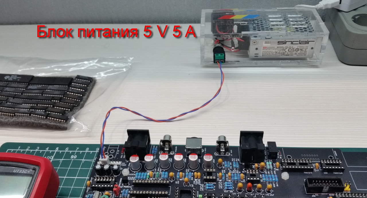 Включаю питание. Сразу замеряю напряжение на плате. У меня напряжение упало до 4.93 вольта. Это нормально. Проверил нагрев микросхем с помощью сертифицированного пальцометра. Все чипы едва теплые.
