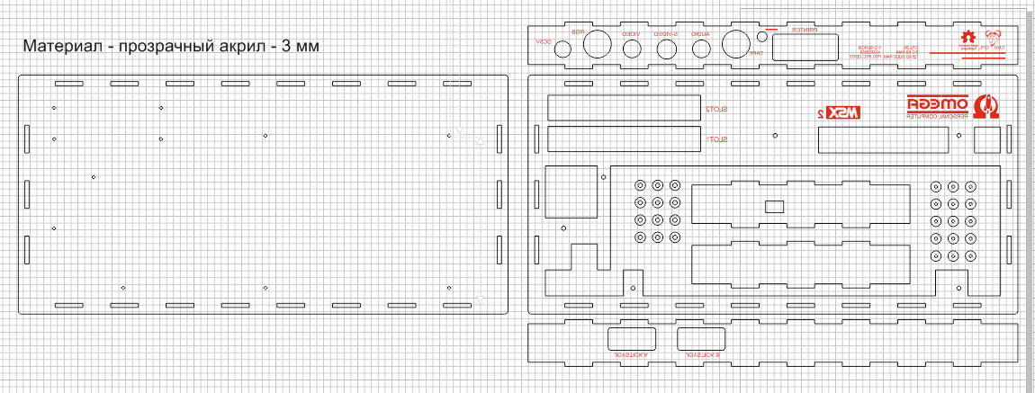 Сначала я распечатал заготовки на обычном принтере, вырезал их из бумаги и прикинул к реальным платам. Все сошлось. В процессе примерки выяснил, что высоту корпуса можно уменьшить на 3 мм. Сделал высоту 34.24 мм. Кроме этого, чуть уменьшил ширину пазов, с 3.175 до 3.05 мм. Чтобы детали не болтались. При этом, надо следить за толщиной листа акрила. Если его толщина будет более 3.1 мм - уже возможны проблемы.