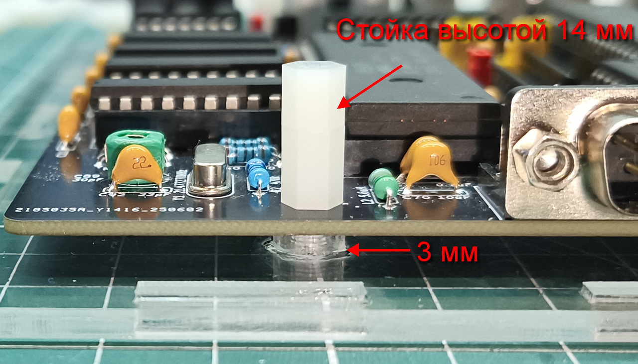 Ставлю материнскую плату Омеги на место. Прикручиваю сверху нейлоновые стойки высотой 14 мм (временно сделал из двух 6+8 мм):