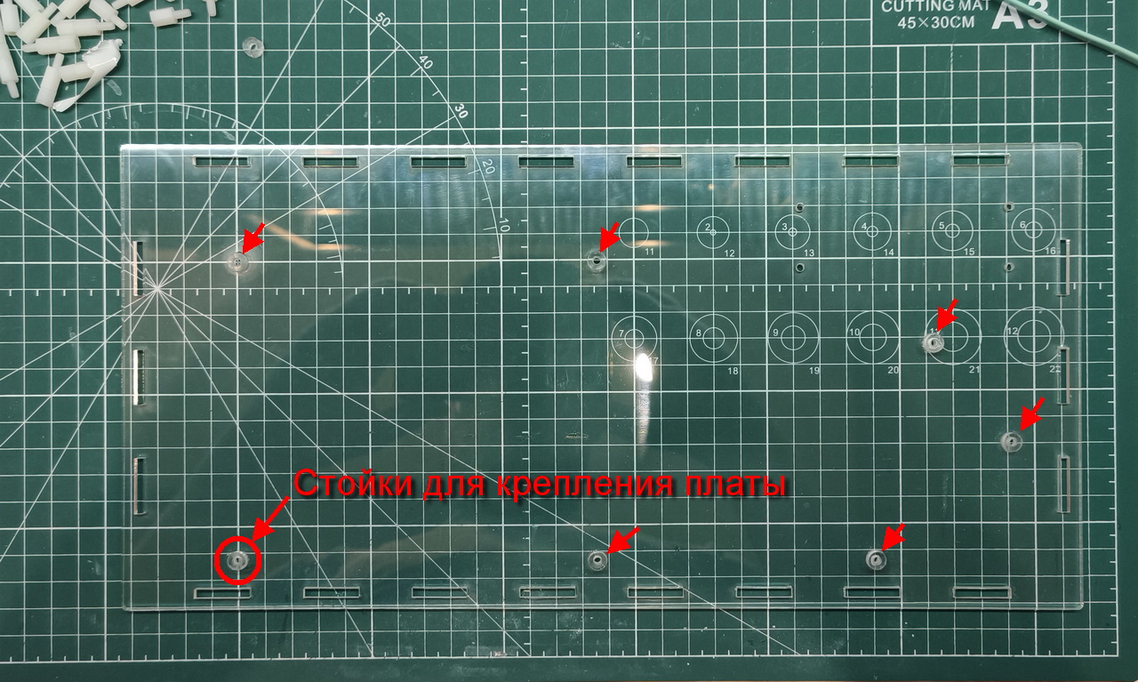 Перед вклейкой советую предварительно примерить стойки с реальной платой. В моем случае, два крайних левых и одно крайне правое отверстия были смещены буквально на 0.5-0.8 мм от отверстий, которые были намечены в поддоне. Пришлось чуток их растачивать и переклеивать стойки "по месту". Почему так произошло я не знаю. Возможно, виновата точность (линейность) лазерного станка.