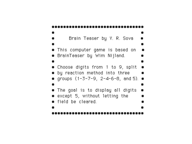 Эта компьютерная игра основана на «BrainTeaser» от Wim Nijland. Выбирайте доступные цифры от «1» до «9», разделяющиеся по методу реагирования на три группы («1-3-7-9», «2-4-6-8» и «5»). Цель — отобразить все цифры, кроме «5». Только следите, чтобы поле полностью не очистилось.