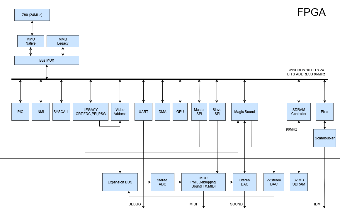 Пояснение к схеме: Устройства типа PIC, IPC, NMI — это простейшие механизмы на основе регистров и триггеров, предназначенные для быстрого детектирования источника прерываний или сообщений. Фактически, это механизм ускорения работы процессора не за счёт повышения тактовой частоты, а за счёт минимизации расходов на опрос периферии, проверку флагов и активное ожидание. Это, кстати, результат наблюдений за работой Aleste 520EX — анализ её «узких мест» показал, где процессор тратит много ресурсов на рутину, которую можно упростить добавлением одного считываемого регистра.