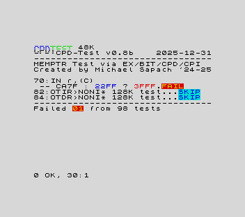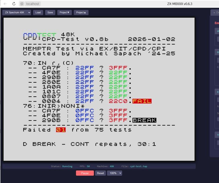 Очередность действий не та... В MEMPTR должно попадать не значение BC + 1 как таковое, а адрес, который выкладывается на шине для чтения порта, который затем инкрементируется. А тут вы в B прочитали значение из порта, и в BC уже не то, что нужно для занесения в MEMPTR.Код:case 0x40: this.b = this.inPort(this.bc); this.f = (this.f & this.FLAG_C) | this.sz53pTable[this.b]; this.memptr = (this.bc + 1) & 0xffff; this.tStates += 12; break; // IN B,(C)