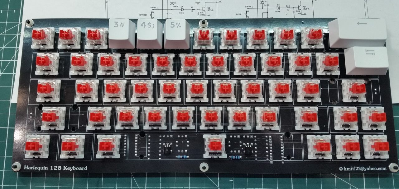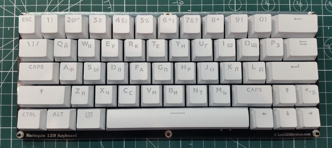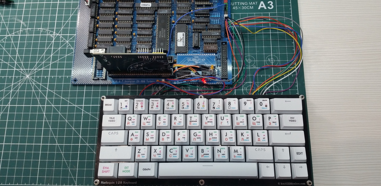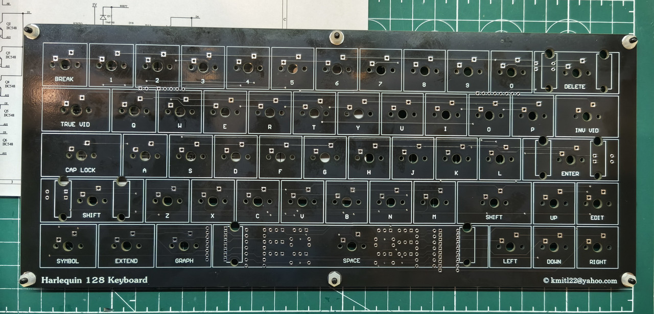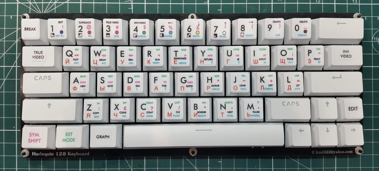 В одном из телеграмм-каналов господин Freiwind предложил мне плату клавиатуры для Спектрум-клона Harlequin 128. Она не копирует раскладку оригинального ZX Spectrum+. Для уменьшения количества клавиш убрали знаки препинания, которые можно набирать через клавишу Symbol Shift.