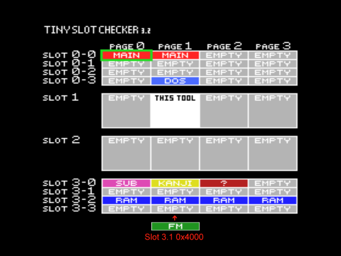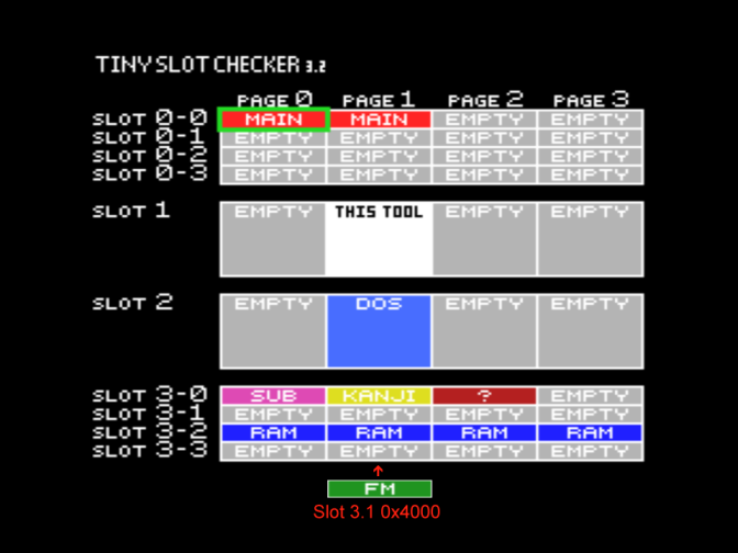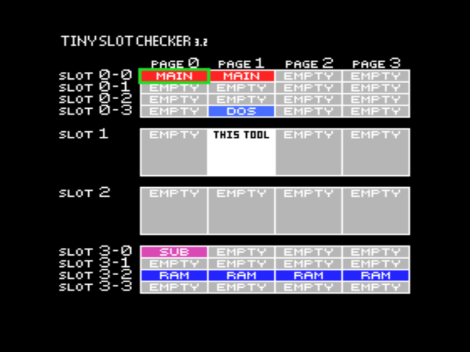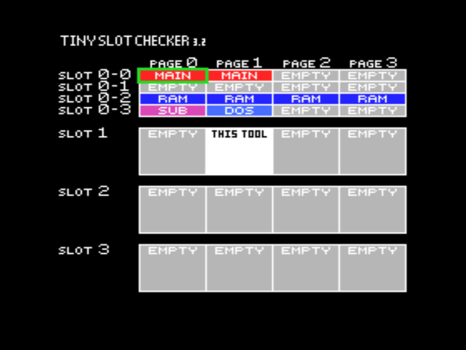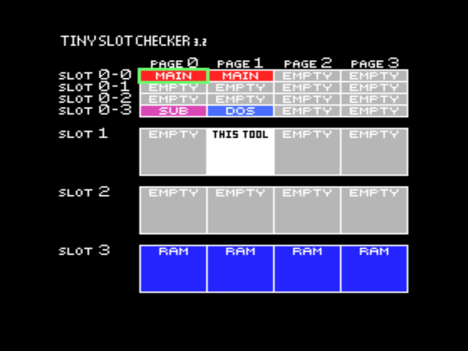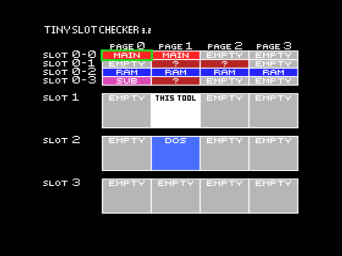 На скриншотах MAIN означает MSX BIOS и MSX BASIC, SUB означает SUBROM, RAM означает ОЗУ, DOS означает дисковое ПЗУ, KANJI означает модуль Kanji (для конфигурации MSX2+). Знаки вопроса означают присутствие неидентифицированных модулей ПЗУ - в оригинальной конфигурации это корейские модули Hangul, а в конфигурации MSX2+ это вторая часть модуля Kanji.