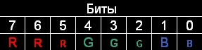 Сейчас использую следующую раскладку битов цветов в байте при отображении без палитры: