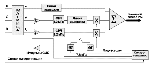 2. Сигналы U и V пропускаются через фильтры НЧ (ограничиваются по частоте до 1,2 МГц). Затем V задерживается на одну строку (64 микросекунды) и модулирует (частотно) поднесущую цветности (4.433 618 МГц) имеющую не постоянную фазу, а изменяющуюся от строки к строке на 180 градусов. U так же модулирует поднесущую цветности, но ее фаза неизменна. Затем сигналы суммируются. Сигналы гашения и синхронизации подмешаны в Y изначально (в ZX Spectrum). В приемнике PAL сигнал цветности проходит линию задержки на длительность одной строки, после чего происходит его сложение и вычитание с основным (незадержанным) сигналом. В процессе этого совпадающие по фазе сигналы складываются, а противоположные по фазе - вычитаются. Таким образом, сигналы V и U полностью разделяются, что исключает возникновение перекрестных искажений. Однако это приводит к уменьшению цветового разрешения по вертикали ровно в два раза (до 7,8кГц).