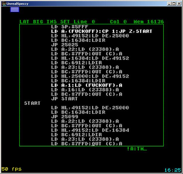 Пишу я прогу в STORM'е. В нем все работает как надо - рис. vid.PNG. После компиляции кода появляется глюк - рис. viderr.PNG ему соответствует загрузчик на бейсике - рис. zagr1.PNG. Если использовать загрузчик - рис. zagr2.PNG - то просто програ сливается в 48к. <программирую на эмуляторе под ZS Scorpion 256 - потому что раньше им в реале пользовался>.