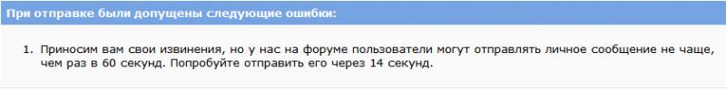 Мало того что текст в оповещалке в электропочте прибили, так еще и 2 сообщения за 1 минуту отправить никак. Я понимаю что спаморезка и прочее. Но 2 разных сообщения 2 разным пользователям уже как нагловато выглядят. Я же не рассылкой занимаюсь елы-палы.