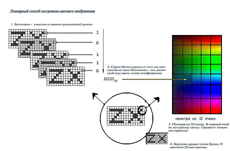 Кто не слыхал (а таких людей тьма, т.к. не каждый программировал для Амиги), то вот немного по планарной схеме составления изображения. В случае чего, пусть амижники меня поправят, но вроде так. Короче, в PC-шном "чанк"-моде у нас одна точка - это "несколько бит в видеопамяти которые идут один за другим". Пример: одна точка - один байт. В амижном планар-моде (битплановый) - биты, кодирующие color одиночной точки расположены не в ряд, а в нескольких одинаковых по размеру видеомассивах, по одному и тому же бит-смещению.