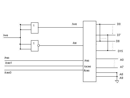 /RAS завел как и было. далее на памяти есть /WE и /OE а на кворуме только /WE сделал так на /WE подал сигнал через ИЛИ а на /OE через ИЛИ-НЕ с одного и тогоже провода с кворума /WE. включаю проходит тест памяти загружается меню кворума нажимаю запуск бейсика и начинается фигня при нажатии на клвиши начинает вывдить полосы надписи по экрану разбрачывать перезагружаться и тп. попробовал использовать две микры памяти и только /LCAS чтоб было как в оригинале - таже самая картина.