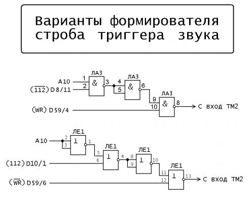 Для триггера звука не нужно инвертировать строб с выхода дешифратора. Нам без разницы по какому фронту строба сработает триггер (без разницы будет фронт звука на 400 НСЕК раньше или позже).