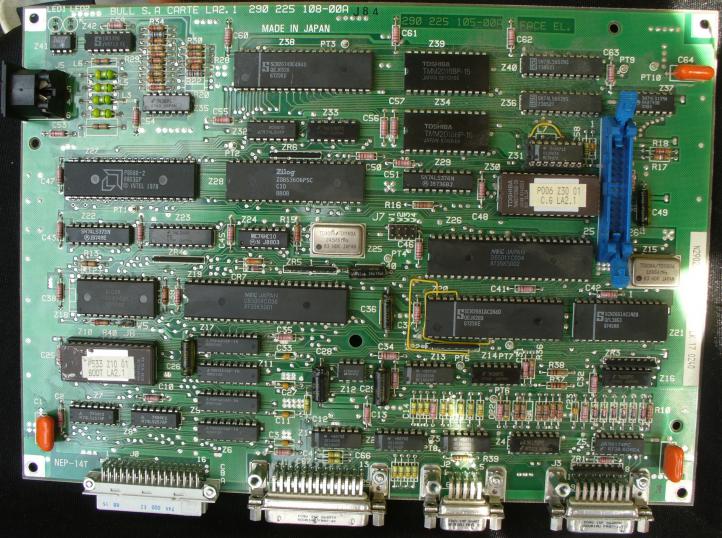 Он на 8088 проце. Я правда уже его сдул, но сдул аккуратно и ничто не мешает поставить панельку. На плате надписей много, в том числе BULL S.A CARTE LA2.1 290 108-00A NEP-14T . Интересна так же распиновка вон того синего разъема на плате - там по идее видео+питание. Ну и вообще, что- чего..