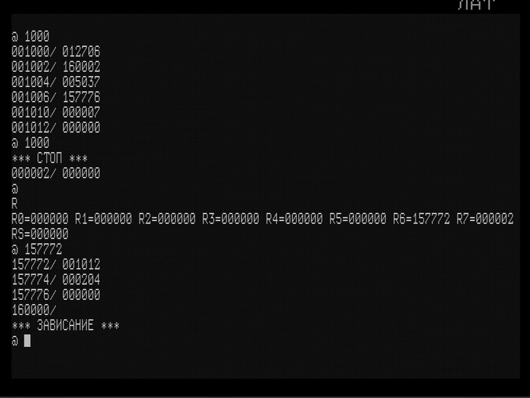 Любопытно, что у 1801ВМ1 чтение нового значения PSW из вектора прерывания происходит с копированием младшего байта и обнулением старшего, что является очевидной ошибкой.Код:try { SP -= 2; word wSP = SP; SP -= 2; CheckAddrWrite(wSP); WORD( wSP &(~1) ) = PSW; CheckAddrWrite(SP); WORD( SP &(~1) ) = PC; } catch(int) { return TrapTo_4(); } PC = WORD( wVector ); PSW = BYTE( wVector +2 );