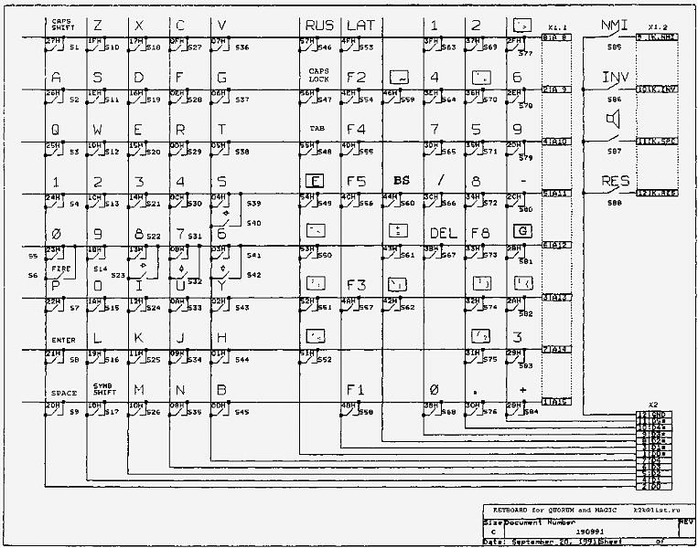 Судя по схеме, не проходит сигнал с контакта 6 разьема клавиатуры до входа D3 (вывод 8 микросхемы D6 - ИР22) регистра порта 0xFE.