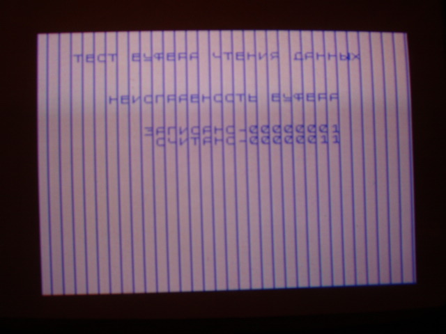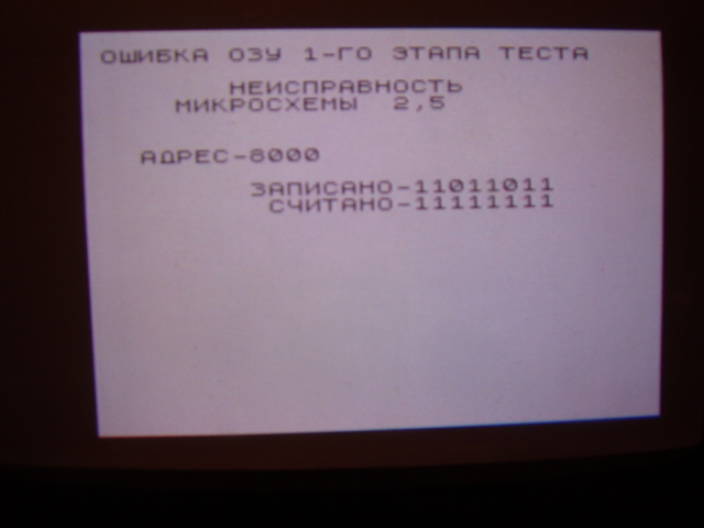Добавляю. Присмотрелся к тем каракулям что на экране написаны и понял что это не Z, а ноль так отобразился. Получается что записано: 00000001, а прочитано 01000011. Отличия в двух битах - D1 и D6. Что и требовалось доказать. Исходя из логики что комп когда-то работал можно заключить что это не дефект сборки, поэтому вероятность повреждения дорожек минимальна, а вероятность сдохших микрух - соответственно повышенная. Так что выкусывай, не стесняйся.