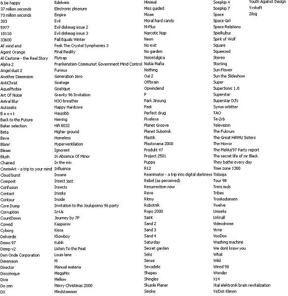 От автора:, -"Вашему вниманию предлагается уникальный диск, на котором собраны более трехсот работ компьютерных композиторов и художников - номинантов международных конкурсов в среде DemoScene. Отличительная черта этих программ - сложная компьютерная графика, работающая в режиме real-time, оригинальное музыкальное оформление и неповторимый стиль. На нашем диске собраны работы по трем направлениям: в директории BIG находятся программы, на объем которых не было конкурсных ограничений - большинство из них очень сложные, красивые, с прекрасным музыкальным оформлением; в директории MEDIUM собраны программы объемом от 120 до 1000 килобайт - такие программы легко влезают на обычную трехдюймовую дискету, но они не поразят вас обилием спецэффектов, хотя среди них встречаются весьма оригинальные; в директории SMALL находятся программы объемом от 256 байт (!!!) до 64 килобайт - эти программы повышенной сложности, когда авторы соревнуются своим умением в меньший объем уместить большее количество информации.