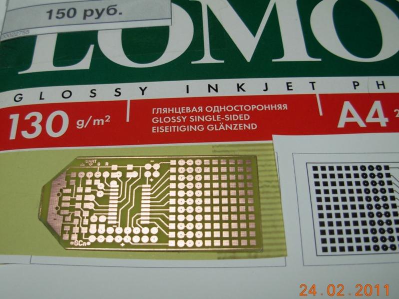 Далее, вырезанный кусок фотобумаги с "образом" платы ложится рисунком вверх на лист резины средней плотности. Поверх бумаги укладывается подготовленный кусок тестолита, медью вниз (на рисунок). Т.е. делается бутерброд-наоборот. При этом за счет резиновой подложки получается равномерный прижим бумаги с тонером и медной фольги платы.