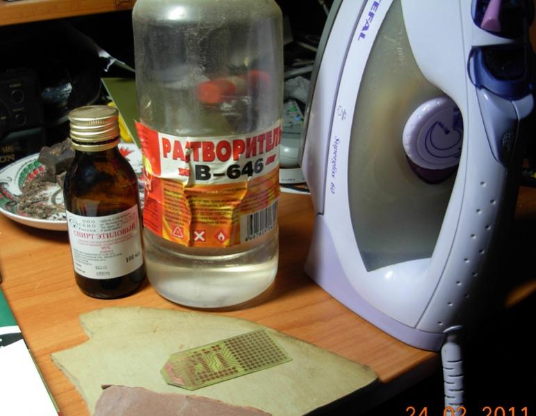 Потом смачиваем другой ватный диск самым обычным растворителем "646" и спокойно стираем тонер с платы. Потом протираем диском со спиртом - и плата готова.