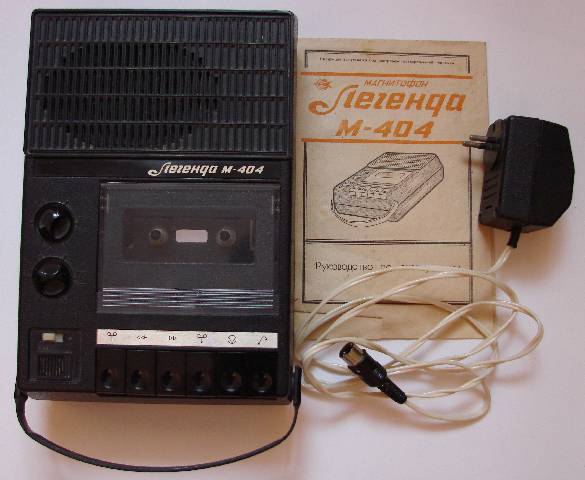 Имеется в наличии компактный магнитофон (265x175x85 мм) советского производства "Легенда М-404" 1990 года выпуска. Работоспособность сего аппарата проверить не смог(нет розеток к чему подключать и нет соответствующих переходников).