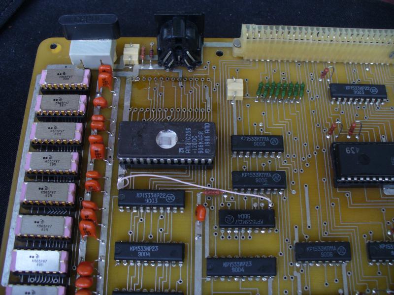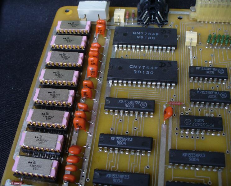 Пробовал три варианта: 1) в качестве SYNC использовал пин с разъема c сигналом VIDEO. Самый лучший вариант, но при загрузке с кассеты изображение периодически "трясется" вверх-вниз. 2) Брал сигнал непосредственно с 8 ноги DD14. Изображение трясется постоянно, плюс еще в верхней части как-бы больше серого чем в нижней. 3) Брал сигнал до кондюков С6,C7 - трясется, вверху экрана серого больше чем внизу.
