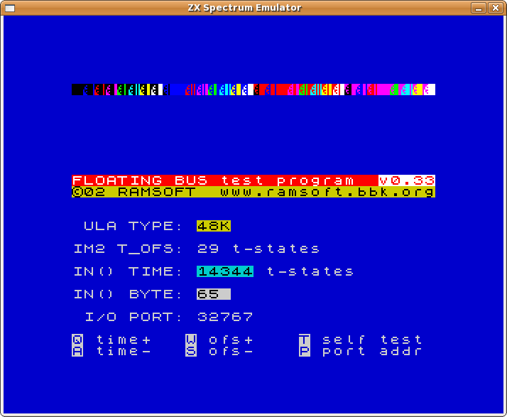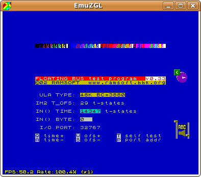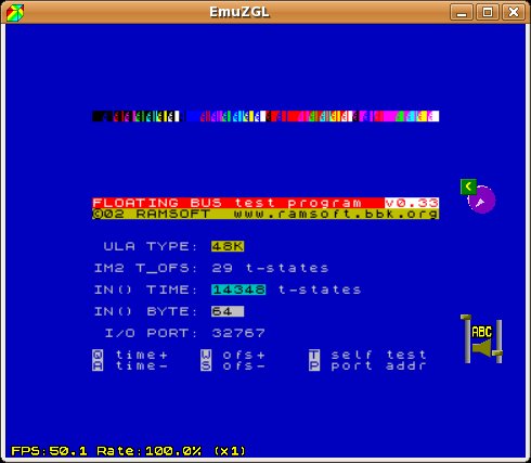 FloatSpy: читаться должны значения с шины. Т.е. пиксели и атрибуты. Вот я сейчас выбрал 128К, загрузил FloatSpy, нажал T, он мне спустя время выдал Floating bus OK for ULA 128K. Кстати, там у меня изначально показывает IN() BYTE: 0, и во время и после теста тоже. Кстати, для модели 48К картинка совершенно аналогичная, только он там 48К пишет.