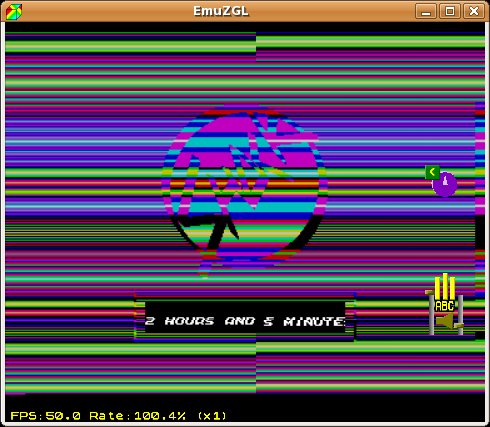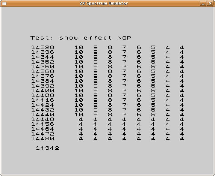 С эффектом снего интересно получилось. Сам по себе тест прошел нормально, и снег я увидел. Но после загрузки (без сброса) очередного снапшота (.z80) снег продолжает идти как ни в чем не бывало. ;-) Это видно на одном из скриншотов.