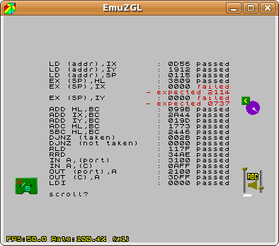 Вот с этим поподробнее. Я сначала поправил глупую ошибку в ADC16, а потом начал смотреть на LDA I/R, и обнаружил такую штуку. Или этот тест не учитывает баг в Z80 с установкой в флаге P/V значения 1, пока на вход ~INT активен (кроме случая, когда предыдущая команда была EI), независимо от значения IFF2. Либо тест делался на машине с коротким интом (у меня 23, а там могло быть даже 22, и то уже существенно: разница нашлась как раз когда выполнялась загрузка LD A,R, и T было 22). Но это даже не важно. А важно то, что тест несколько некорректен по отношению к командам BIT n,(HL/IX+k/IY+k) - результат зависит от предыдущих тестов. Наверняка автор не знал, как стереть memptr и привести его в начальное состояние перед выполнением тестов. Так вот, если пройти тест LD A,R/I на другом эмуляторе (я использовал EmuZWin 2.7/build 2.8), остановиться и сбросить Z80-снапшот и загрузить в EmuZGL, то дальше все тесты на memptr проходят на ура. LD A R/I я исправлять не буду, т.к. полагаю, что сделал эту команду правильно (есть даже прога какая-то, которая виснет, если баг Z80 не реализован, жаль, не помню, какая именно).