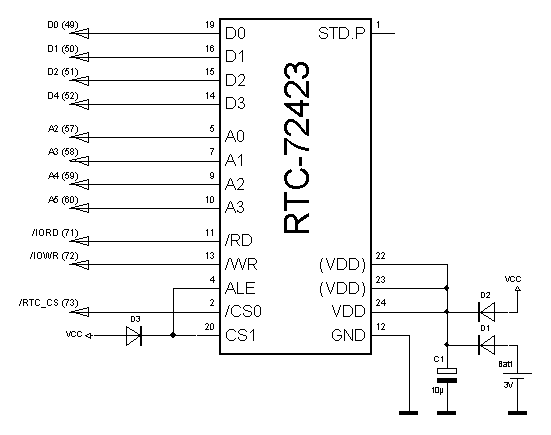 Вот схемку намалевал, только RTC часть. Во всяком случае сейчас сделано именно так. В скобках номер ноги на трапдор слоте.