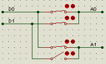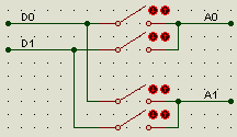 Скажем на A0 ничего (все таки через диод подключено, то есть здесь лог. 1), а A1 замыкается на землю (в общем эта линия выбрана, лог. 0). Что происходит: кроме того, что ток течет через 3ю кнопку от D0 к A1, он также течет и от D1 через 2ю, затем 1ю, а затем и саму 3ю кнопку. Таким образом получается что оба D0 и D1 замкнуты на землю (лог. 0).
