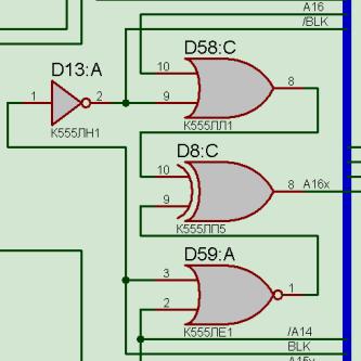 Получается так: если сигнала БЛК нет, то на мультиплексоры адреса памяти передаётся бит А16, а если сигнал БЛК есть, то на ту же линию передаётся инверсный А14, причём выходные мультиплексоры памяти Д43 и Д44 в этот момент будут закрыты тем же БЛК. Есть идеи, зачем это могло быть сделано?