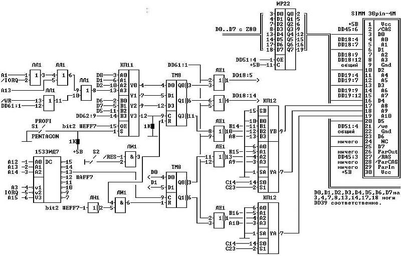 возьми любую понравившуюся от любого спека. приаттачь тут. по ней и подскажем чего куда у нее паять для пентагона. схем очень много расширенияю смысл как правило один. сигнал SCR цеплять на мультиплексор D23 пин 10 если не ошибаюсь. адреса а14` и a15` соответственно на 12 и 4ю ноги DD23. остальное- показывай схему расширения - будем думать