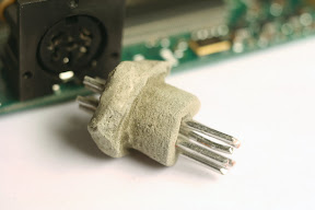 В качестве штырьков использовали подножный медный провод, которым делают проводку. Что-то типа двушки -- луженый он туго входит и хорошо держится внутри. В качестве шаблона использовали разъем на плате 1541У. Основание первого разъема лепили из пластилина "Пластика", того, что отвердевает от нагревания. Получилось ничего так, но мы его изрядно растрясли пока вынимали, а Пластика, даже после отвердевания, не очень-то тверда.