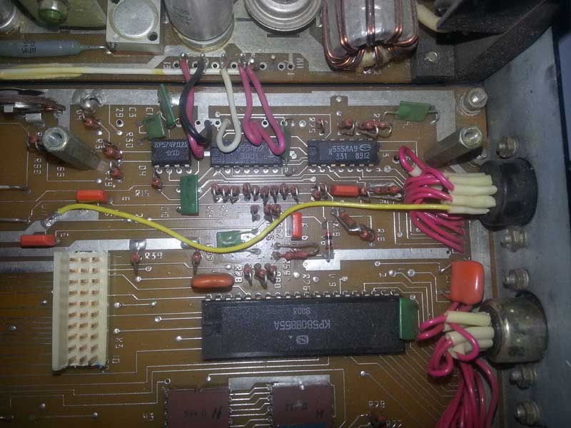 Вечную проблему с питанием адаптера ТВ-приёмника решил следующим образом. Нога 1 разъёма "ТВ" X10:1 используется для вывода чёрно-белого видеосигнала, который формируется из RGB, HL и КССИ на основной большой плате.