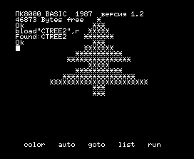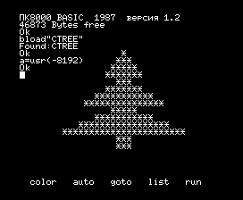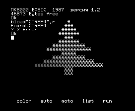 Продолжается битва елок. Комодорщики урезали версию для C64 до 33 байт, что мотивировало еще подумать над версией ПК8000 - сократил байт (стало 34). Теперь ПК8000 между C64 (33) и PLUS/4 (35). Версия 4 выходит в бейсик с сообщением об ошибке (рисунок не портится), в правилах не увидел запрета на это.