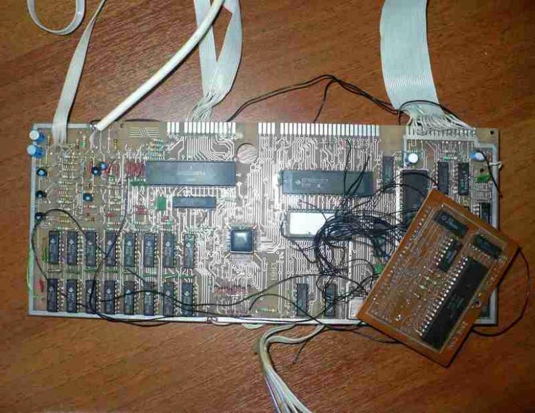 Пока аккуратно отпаял имеющиеся "хвосты", в том числе платку с музсопроцессором (её - временно), просмотрел и немного подправил монтаж... Снял ВГ'шку, подал на плату 5 вольт: генератор - генерирует, проц вроде "завёлся", на видеовыходе есть сигналы R, G, B и синхросмесь, а так-же ч/б видеосигнал. К сожалению при подключении этого ч/б сигнала к компьютерному LCD-монитору DELL с композитным входом, вижу чёрный экран монитора с надписью "подайте видеосигнал на выбранный вход"Пока мысль о большой амплитуде подаваемого сигнала - реально от нижнего уровня синхры, до уровня "белого" около 3-х вольт, а должно быть - 1 вольт (0,3В - синхра + 0,7В видео), к сожалению сегодня не хватило времени проверить...