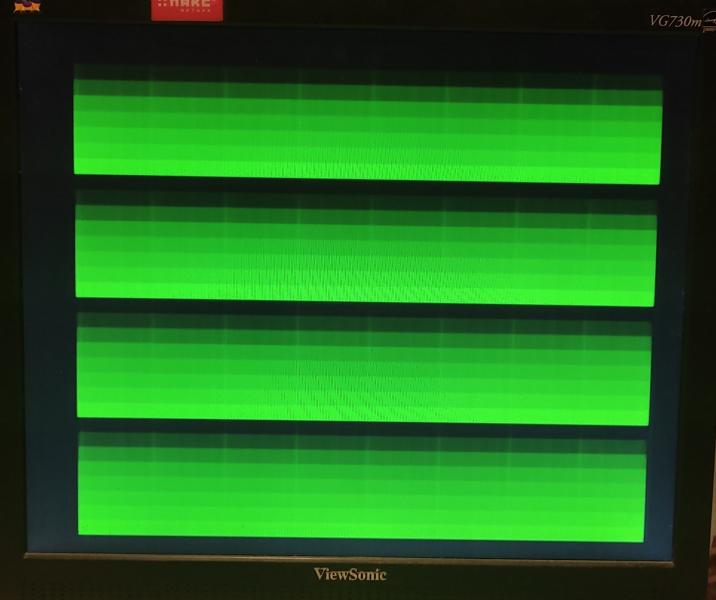 Проверил, и, кажется, я понял, о чём речь. Чётные и нечётные биты изображения имеют разную ширину, что особенно заметно в режиме 256х512 и на картинке, растянутой на широкий экран (9:16 или около того). Думаю, тут может быть виновата задержка из-за дополнительного элемента в цепи (Д33.4, к155ла3), можно перепаять эту микруху на что-то более современное быстрое, или подобрать конденсатор С25 для обеспечения равного времени включения битов... Если разница так сильно бросается в глаза.