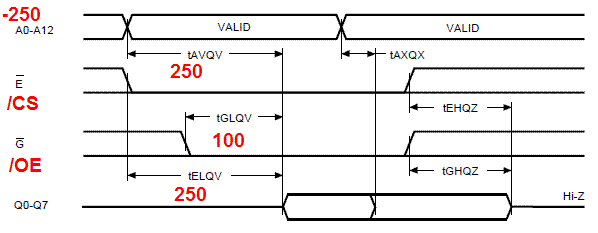 Вот вторая картинка из даташита ПЗУ (быстродействие 250 нс, отсчитывается от адреса и /CS=0 на входе ПЗУ).