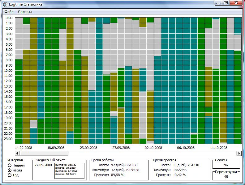 Считает сколько времени компьютер работал, сколько простаивал, рисует соответственный график. Считает количество сеансов и перегрузок. Как служба не работает - показывает только время активного сеанса.
