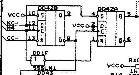 немного не так. я отрубил 11ую ногу DD42(тм2) и повесил на неё проводок со 2ой ноги DD4(ие7). в оригинале на ТМ2 идёт сигнал Н4. в фирменной инструкции для изменения синхронизации советуется просто резать перемычки у счётчика