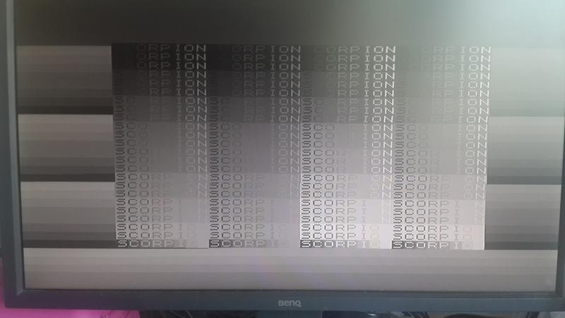 В соседней ветке "Два вопроса по желтому Скорпиону" товарищ krotan выложил тестовое ПЗУ Скорпионовское. У меня с ним такой же экран как и у вас, потом цифровые кнопочки нажимаю, идут тесты. Проверял на оригинально зеленом без ПрофПзу.