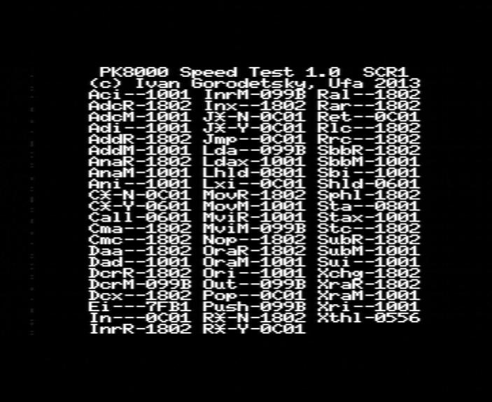 Заранее могу сказать, что результаты в SCR0 и недокументированном (который полностью или частично совпадает со SCR0) режимах скорее всего будут с "нецелыми" тактами из за разного торможения при выводе разных частей экрана (в отличие от SCR1/2), т.е. это будет "среднее время выполнения команды в течении кадра". Чтобы точно определить по отдельности время выполнения команд в этих режимах на бордюре и в активной области нужен, например, таймер, синхронно работающий с процом, но его нет.
