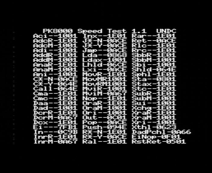 Нужен таймер, причем чтобы обеспечить нормальную точность нужно тактировать процессор и таймер из одного источника. Такой тест для вектора я делал (там частота таймера в 2 раза меньше чем у процессора, но это не принципиально), он успешно работал. Т.е. для ПК8000 я бы смог адаптировать тот тест. Таймер - это не единственный вариант, но, как мне кажется, самый точный. Возможно у кого-то есть альтернативные идеи, интересно было бы ознакомится.