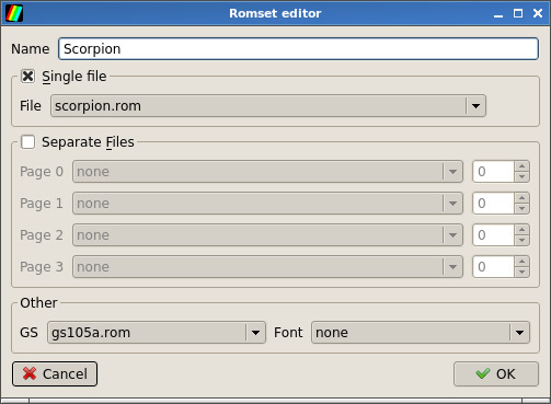 В опциях настройки ромсета ставишь Separate files и выбираешь 4 страницы как пожелаешь. Файл ромсета и порядковый номер страницы в нём. Для скорпиона будет Page0=128, Page1=48, Page2=SOS, Page3=TRDOS. Вангую вопрос "откуда юзер знает, в каких страницах что должно находиться". В разных схемах разный механизм выбора страницы ПЗУ, тут однозначно не скажешь, что в странице 0 - 128й васик или тырдос. Пока что так... Есть идея спрашивать у железяки, какой номер страницы для rom=0 && dos=1, но это опять же не подойдёт для +2/+3 и не-спектрумов