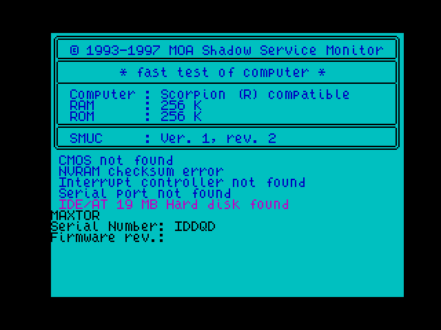 SMUC пофиксился и расширился. Есть порты версии/подверсии, системный порт работает только на чтение (b7, как я понял, показывает незанятость текщего HDD). При запуске профПЗУ 4.01 HDD определяется, читается его паспорт, при заходе в МОА-сервис пункт Hard Disk Utility активен, но потом ВСЁ НАФИГ ВИСНЕТ.