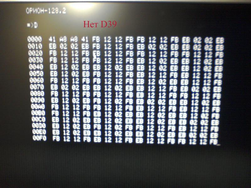 Без D39, как я полагаю, выдаётся то, что осталось в буфре шины данных. В Микроше тоже такая фича есть, там где в области памяти вообще ничего нет, выдаётся слово состояния процессора (которое в такте M1 выдаётся). В принципе, ОЗУ после включения питания примерно так и выглядит. После сброса такое тоже может быть, если он дольше, чем то время, которое информация в ОЗУ хранится без обновления.