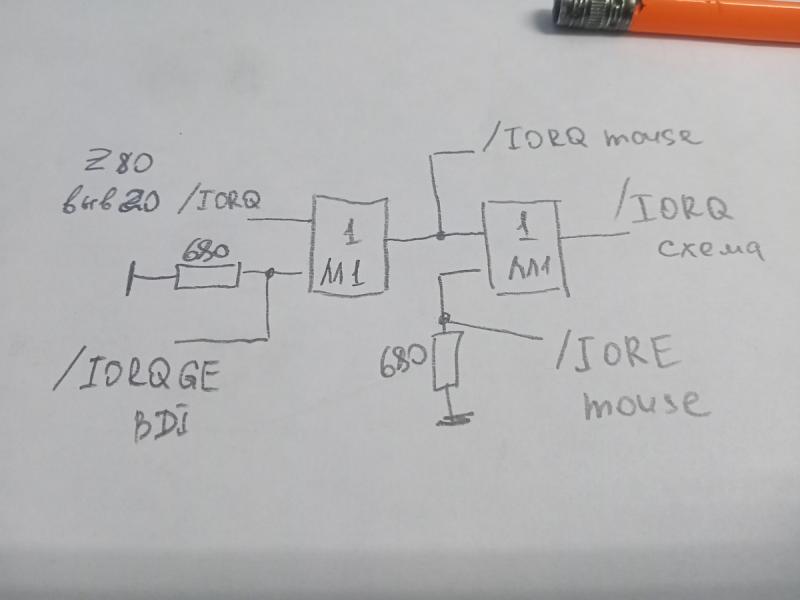 Именно, но есть нюанс - если есть BDI то он вроде (где то попадалось требует себя первым в каскаде) поэтому в данном случае потребуется два элемента. На первый элемент 1 вход вешаем IORQ/ от Z80 напрямую (не знаю как в пенте128 он реализован но если там не каскад на ЛЛ1 то оторвать его от остальной схемы) на второй вход вешаем IORQGE/ c BDI и на него же резистор 680ом прижатый к GND. На первый вход второго элемента сажаем выход первого (он же будет IORQ/ для грызуна) на второй вход этого элемента подаем IORE/ так же повесив на него резистор 680ом притянутый к земле. Выход этого элемента будет IORQ для все остальной схемы (та точка где мы оторвали IORQ на Z80) .